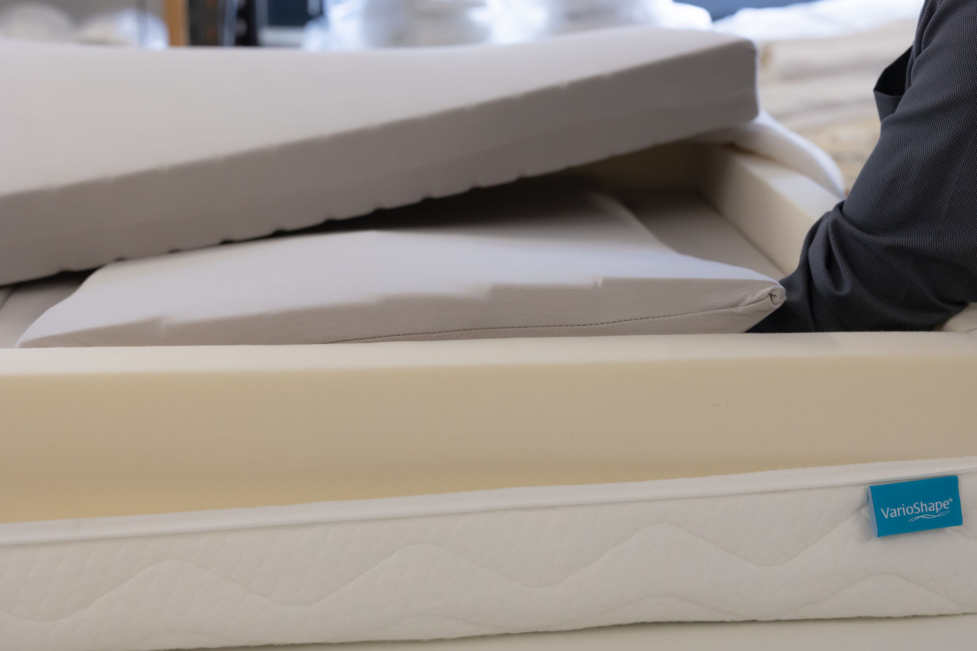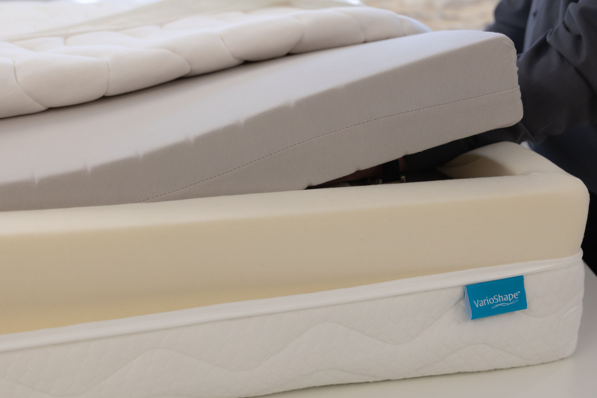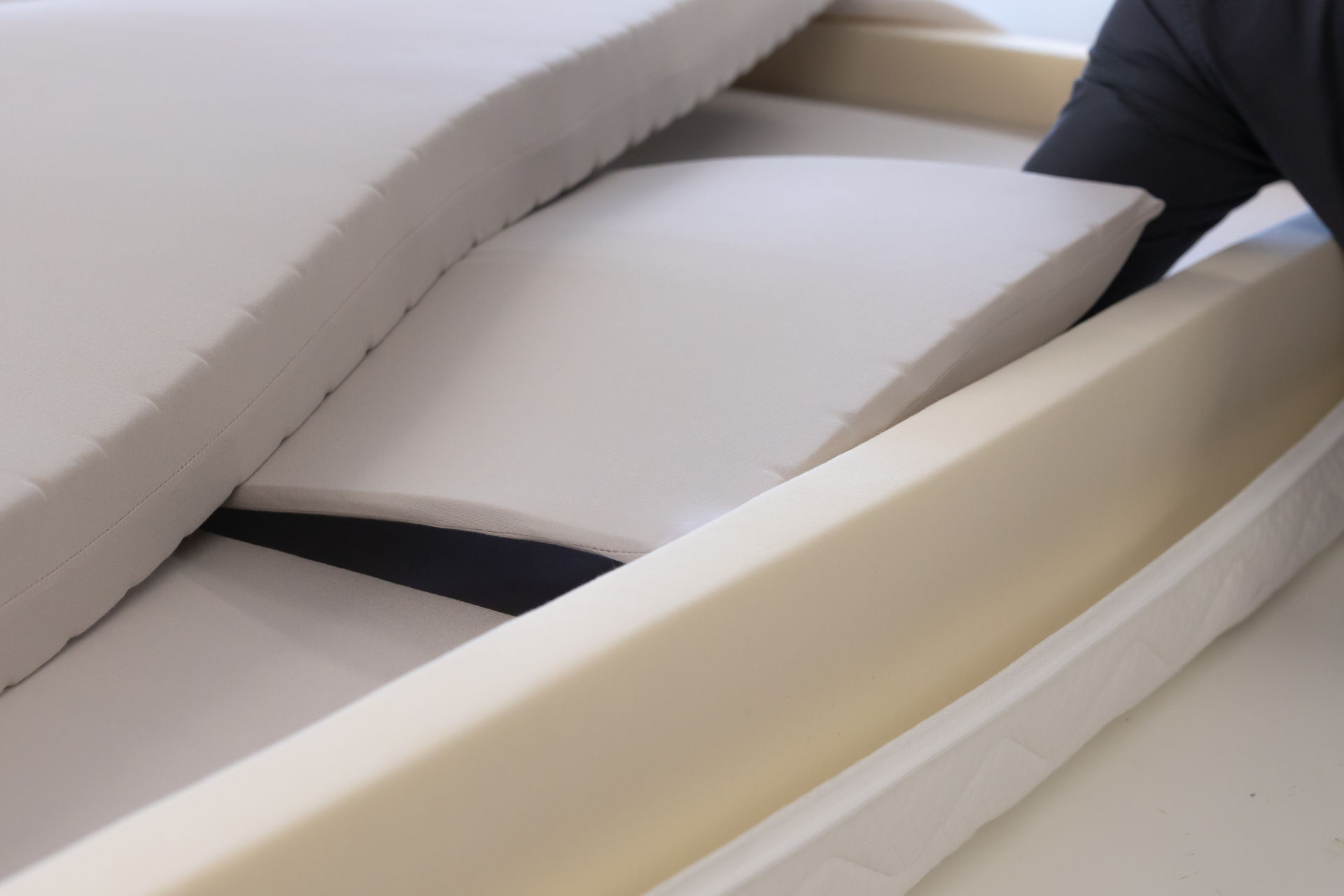 • Durch Austausch von Teil-Bereich (Ober-Matratze, Schulter-Bereich, Gesäss/Hüft-Bereich). In 2 Minuten ausgetauscht.